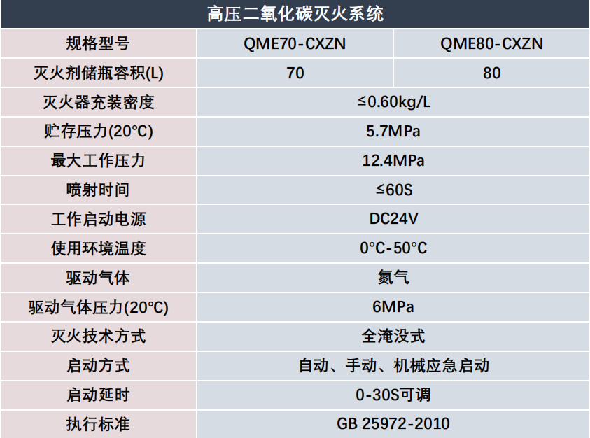 高压二氧化碳灭火系统由瓶组架、灭火剂瓶组、检漏装置、容器阀、金属软管、单向阀(灭火剂管路)、集流管.安全泄放装置、选择阀、信号反馈装置、灭火剂输送管道、喷嘴、驱动气体瓶组、电磁型驱动装置、驱动管道单向阀(驱动气体管路)等组成,是一种智能型自动灭火设备。根据不同应用场所使用要求,可组成单元独立系充、组合分配系统,采用淹没灭火方式,实现对单防护区和多防护区的灭火保护,技术先进、灭火效率高、维护方便。设备具有自动、手动和机械应急操作三种启动方式。