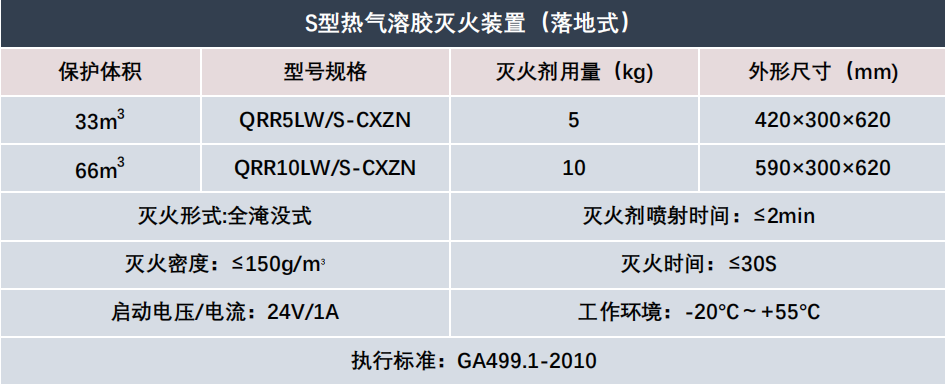 热气溶胶是由凝集法形成的凝集性气溶胶,生成的燃烧产物在离开火焰后冷却而凝集成固态粒子由于其粒径小,扩散性能好,可以扩散到灭火空间的任一角落,而且沉降作用较弱,粒子可以在防火保护空间长时间地保持悬浮状态,而作为全淹没灭火剂使用。气溶胶有落地式气胶胶、悬挂式气溶胶小型气溶胶三种装置,可根据灭火需求和灭火场所灵活选择。